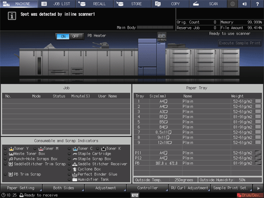 If spots such as paper powder or dust that should be cleaned off are detected on Inline Scanner1 or Inline Scanner2 of Intelligent Quality Optimizer IQ-501, any one of the following messages will be displayed in the message area of the screen, and the machine will stop.