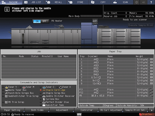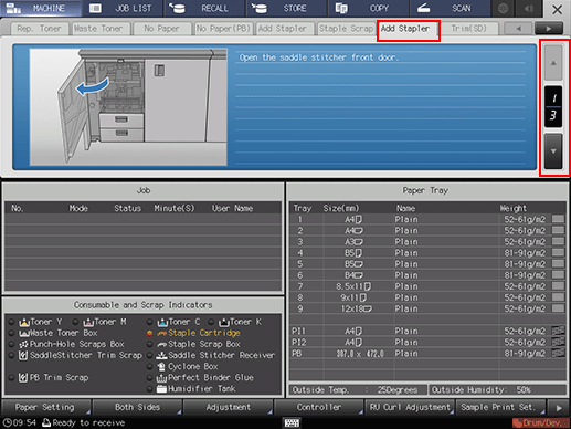 When the staple cartridge of Saddle Stitcher SD-506 becomes empty, the following message will appear in the message area of the screen.