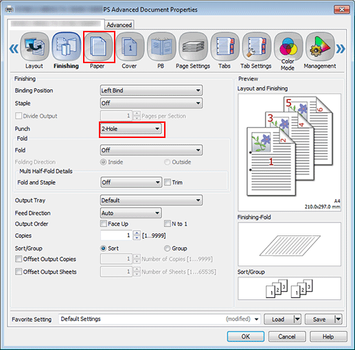 • supplementary explanationSetting Punch on the Finishing tab allows you to make punch holes (2 holes, 3 holes, 4 holes, or Swedish 4 holes). Mount Punch Kit PK-522 to Finisher FS-532.