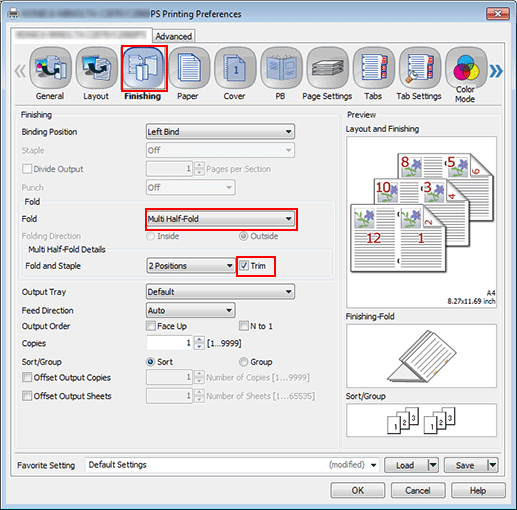 Click the Finishing tab, and then set Fold and Multi Half-Fold Details.