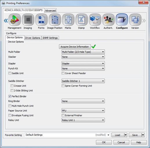 Destination Settings | To check device option information of another main body, select Specify IP Address or Printer Name, then enter the IP address or printer name. This function is helpful when the driver has the destination set to another server instead of the main body. |