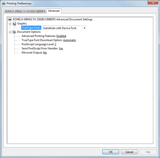 TrueType Font | Substitute with Device Font, Download as Softfont | Set this to substitute a font with a TrueType font. Select Substitute with Device Font if you want the printer to select a similar font instead of downloading the font set. It can shorten the printing time; however, special characters that are not included in the substituted font may be garbled. Select Download as Softfont to download the TrueType font to the printer. |