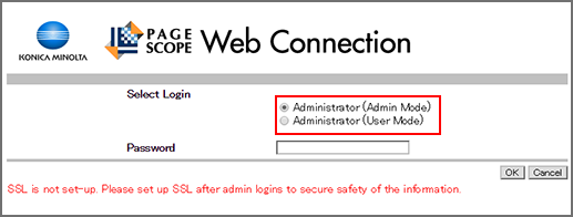 Logging in as an administrator enables you to select the login mode in the password entry screen. When an administrator logs into user mode, Administrator (User Mode) must be selected. |