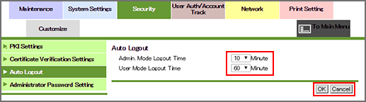 The automatic logout time can be specified respectively in administrator mode and user (public) mode. For example, if a shorter automatic logout time is specified in administrator mode, it will reduce risk that may be caused by a third person’s operations. If a longer automatic logout time is specified in user (public) mode, you can perform operations such as address registration, which is troublesome when using the touch panel, on the Web browser.