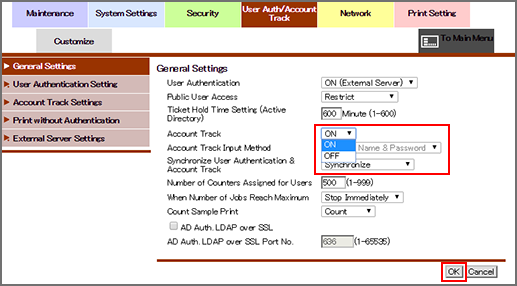 Click Go to Authentication Method to display the General Settings screen. To register an account for account track, specify ON for Account Track.