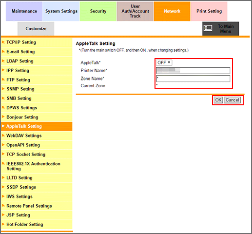 Select either ON or OFF from the AppleTalk Setting drop-down list.