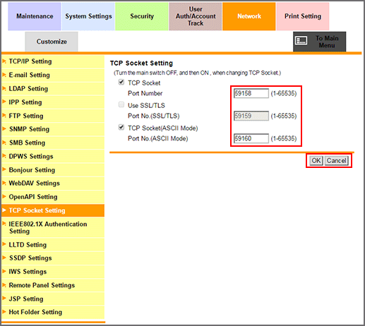 To use TCP Socket (ASCII Mode) on the machine, select the TCP Socket (ASCII Mode) checkbox, and enter a port number if necessary. When it is enabled, PageScope Web Connection can be displayed in Flash mode.