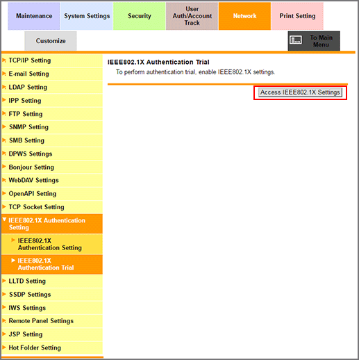 Click IEEE802.1X Authentication Setting - IEEE802.1X Authentication Trial in the Network tab to display this screen.