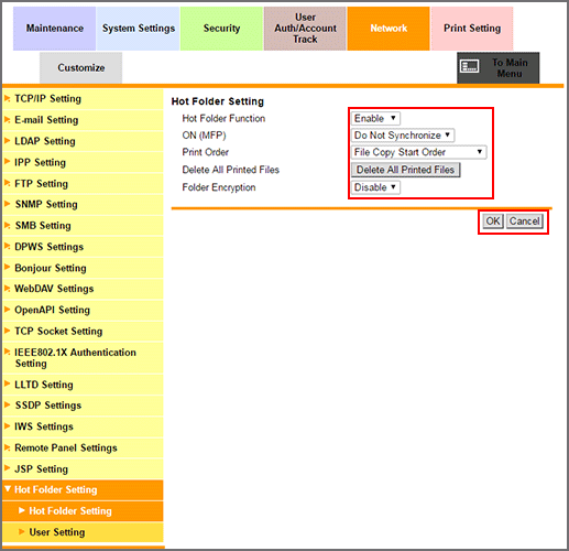 Click Hot Folder Setting - Hot Folder Setting on the menu of Network tab to display this screen.