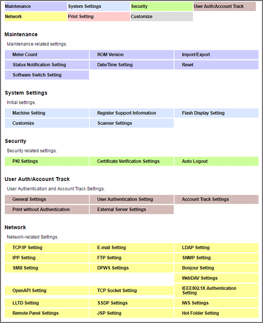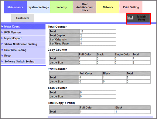 When you click the To Main Menu tab, menu items that can be used in user mode are shown on a single screen.