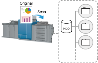 You can save the data scanned from the ADF or the original glass (scan data) to a user box set in the HDD.