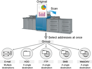 If you register multiple destinations as a group, you can send or save the data scanned from the ADF or the original scanning glass (scan data) to them at one time.