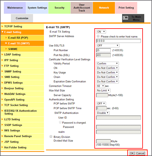This screen allows you to make the settings on E-mail transmission by SMTP. The settings described in this section are always required if you want to use Scan to E-mail.
