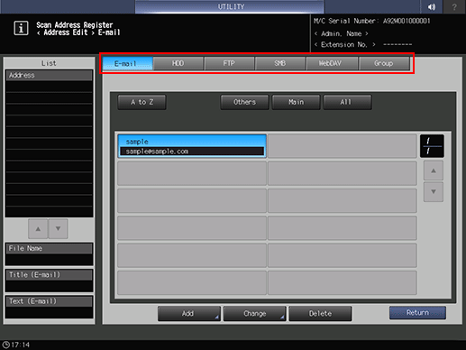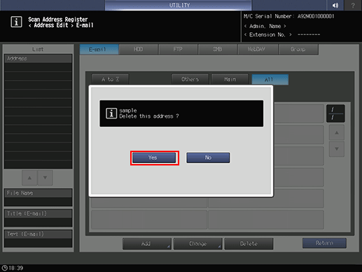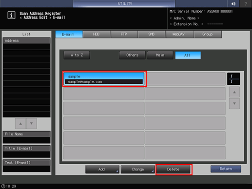 3. Press E-mail, HDD, FTP, SMB, WebDAV, or Group to display a destination to delete.