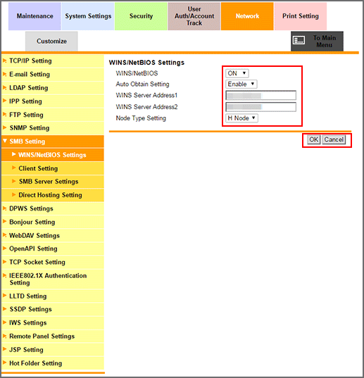 Click SMB Setting - WINS/NetBIOS Settings on the menu of Network tab to display this screen.