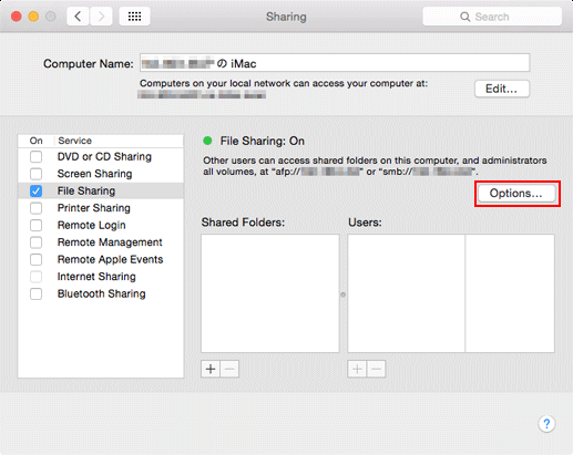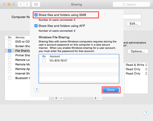 6. Click Options, check that the Share files and folders using SMB check box is selected, and click Done.