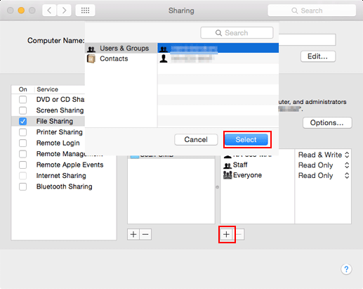 7. Click + at the bottom of the Users list, select a user or group you want to permit access to, and click Select.