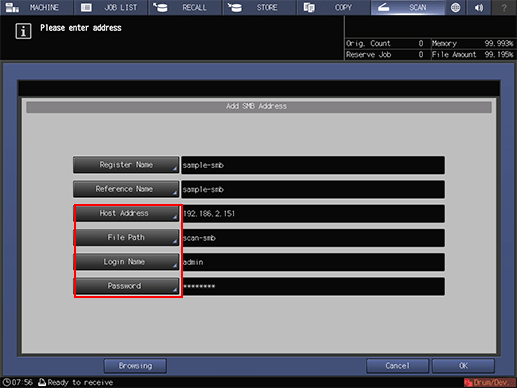 Register the destination SMB server to the machine on the touch panel of the main body.