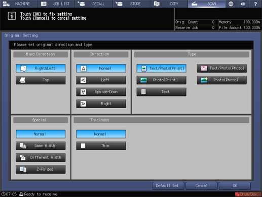 You can set separate scan, bind direction of two-sided original (whether the top and bottom of both sides are the same, or one side is flipped vertically), original orientation, and original type.