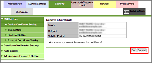 supplementary explanationIf you have removed the default certificate, the Device Certificate List screen is displayed. Specify another certificate as default.