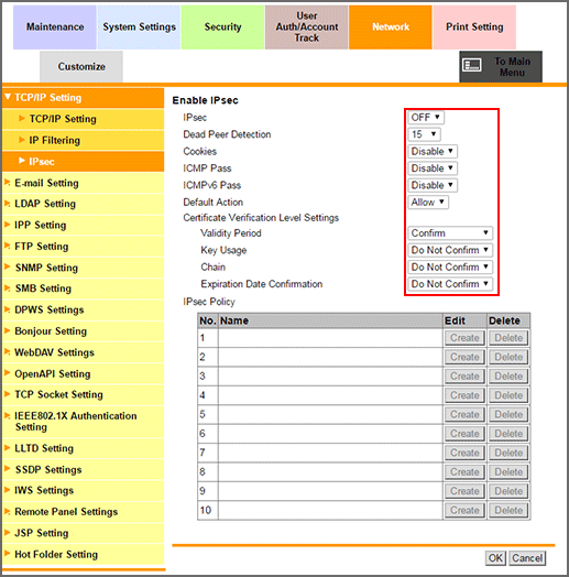 1. In the Network tab, click TCP/IP Setting - IPsec to display the IPsec operation selection screen.