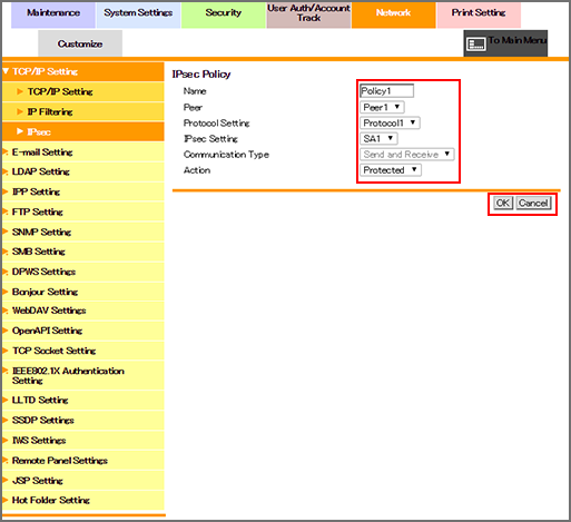 13. Specify the protocol of IPsec Setting from the registered Protocol Setting.