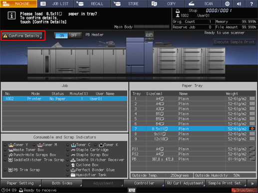 Please load $########## paper in tray$ / To confirm details, touch [Confirm Details]