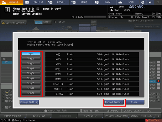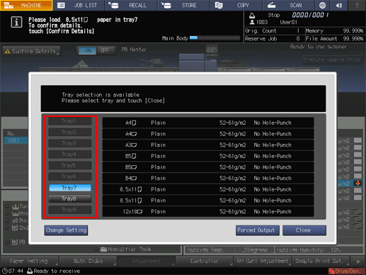 Change the paper setting of another tray (Current Setting) to that required by the print data (Reserved Setting). Load the tray with paper that conforms to specified conditions, and then start printing.