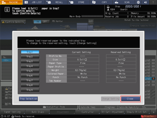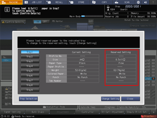 The paper setting of the selected tray (Current Setting) and that required by the print data (Reserved Setting) are displayed.