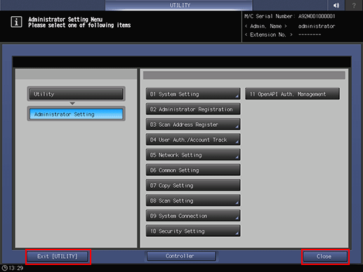 supplementary explanationTo return through the hierarchy of the Utility menu, press Close until the desired screen appears.