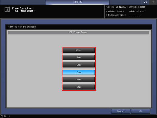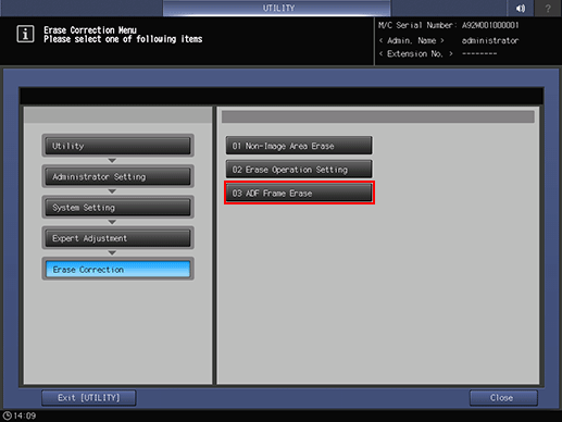 Press System Setting on the Administrator Setting Menu screen, and then press Expert Adjustment, Erase Correction, and ADF Frame Erase in sequence.