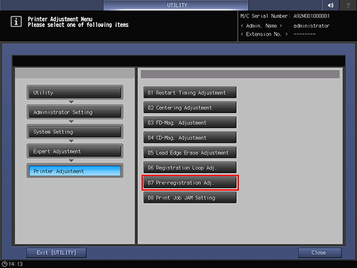 Press System Setting on the Administrator Setting Menu screen, and then press Expert Adjustment, Printer Adjustment, and Pre-registration Adj. in sequence.