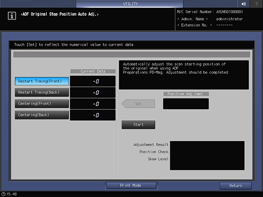 The ADF Original Stop Position Auto Adj. screen is displayed.