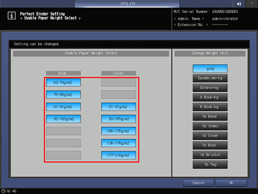 Specify the paper weight available for each of body and cover when using the perfect binder.