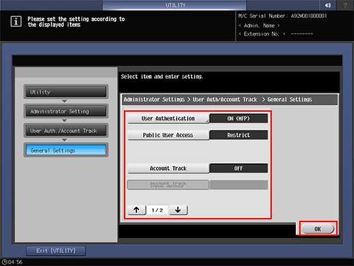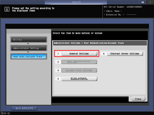 2. Press User Auth./Account Track on the Administrator Setting Menu screen, and then press General Settings.