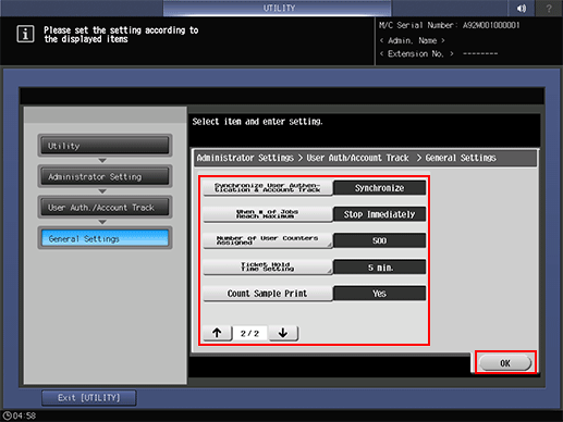 5. Press and select Synchronize User Authen- tication & Account Track or When # of Jobs Reach Maximum.