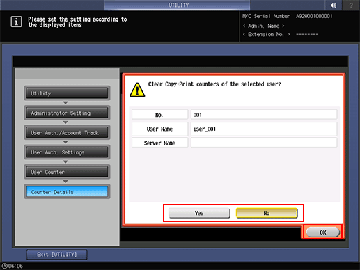 • supplementary explanationSelect the user name of the counter to be reset, and press Counter Details. Press Public (shown in Page 26) to reset the counter for public users, then press Counter Details. The respective Counter Details screens are displayed.