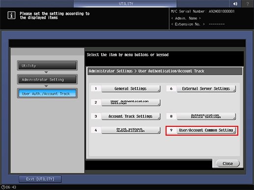 2. Press User Auth./Account Track on the Administrator Setting Menu screen, and then press User/Account Common Setting.
