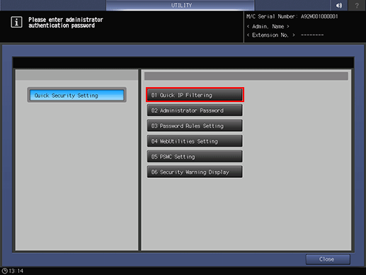 This setting is the same as that of Quick Security Setting - Quick IP Filtering accessed from the UTILITY screen.
