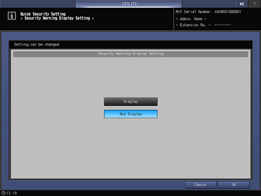 This setting is the same as that of Quick Security Setting - Security Warning Display accessed from the UTILITY screen.