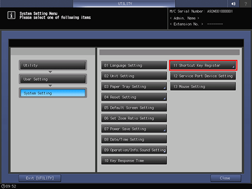 2. Press System Setting on the User Setting Menu screen, and then press Shortcut Key Register.
