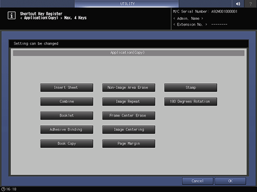 3. To display the shortcut keys under Application on the COPY screen, press Application(Copy) to display the Shortcut Key Register screen.