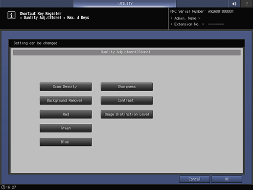 • COPY screen, SCAN screen - Select either shortcut keys or density setting to be displayed under Quality Adj. on the STORE screen. When you select the density setting, the screen does not display the shortcut keys specified in Quality Adj. of the COPY screen and Scan Setting screen accessible from the SCAN screen and STORE screen.