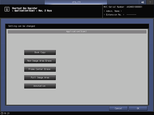 5. SCAN Screen - To display the shortcut keys under Application of the Scan Setting screen, press Application(Scan) to display the Shortcut Key Register screen.