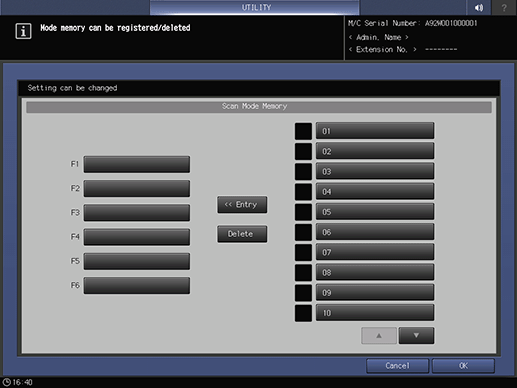 18. To display the Copy Mode Memory shortcut keys under the SCAN screen, press Scan Mode Memory to display the registration screen.
