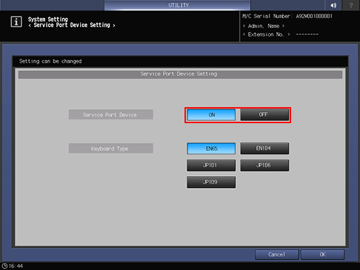 Press System Setting on the User Setting Menu screen, and then press Service Port Device Setting.