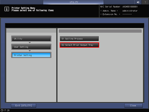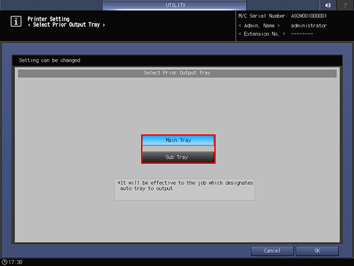 Select the tray to be prioritized as output tray for jobs which designate auto tray to output. Select either the main tray or sub tray.