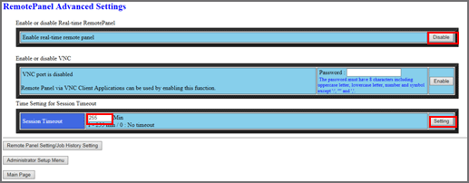The Remote Panel Advanced Settings screen is provided to disable Real-time Remote Panel or to set the time for the session timeout.