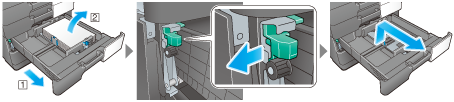 Release the lock as shown in the figure, pull out the paper tray, then remove any unnecessary pieces of paper.