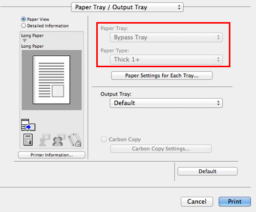 Check that [Paper Tray:] of [Paper Tray / Output Tray] is set to [Bypass Tray] and that the [Paper Type:] is set to the desired paper type ([Thick 1+]/[Thick 2]/[Thick 3]), and also they are grayed out to prevent them from being changed.